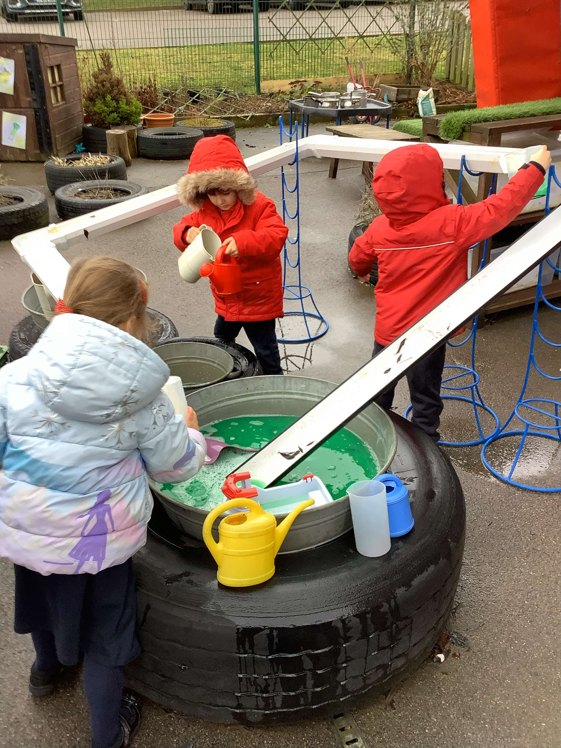 In maths we have been counting objects and weighing objects to see which is heavier and lighter. Outside we made potions using different coloured water and used measuring jugs and tubes to measure the amount of water.