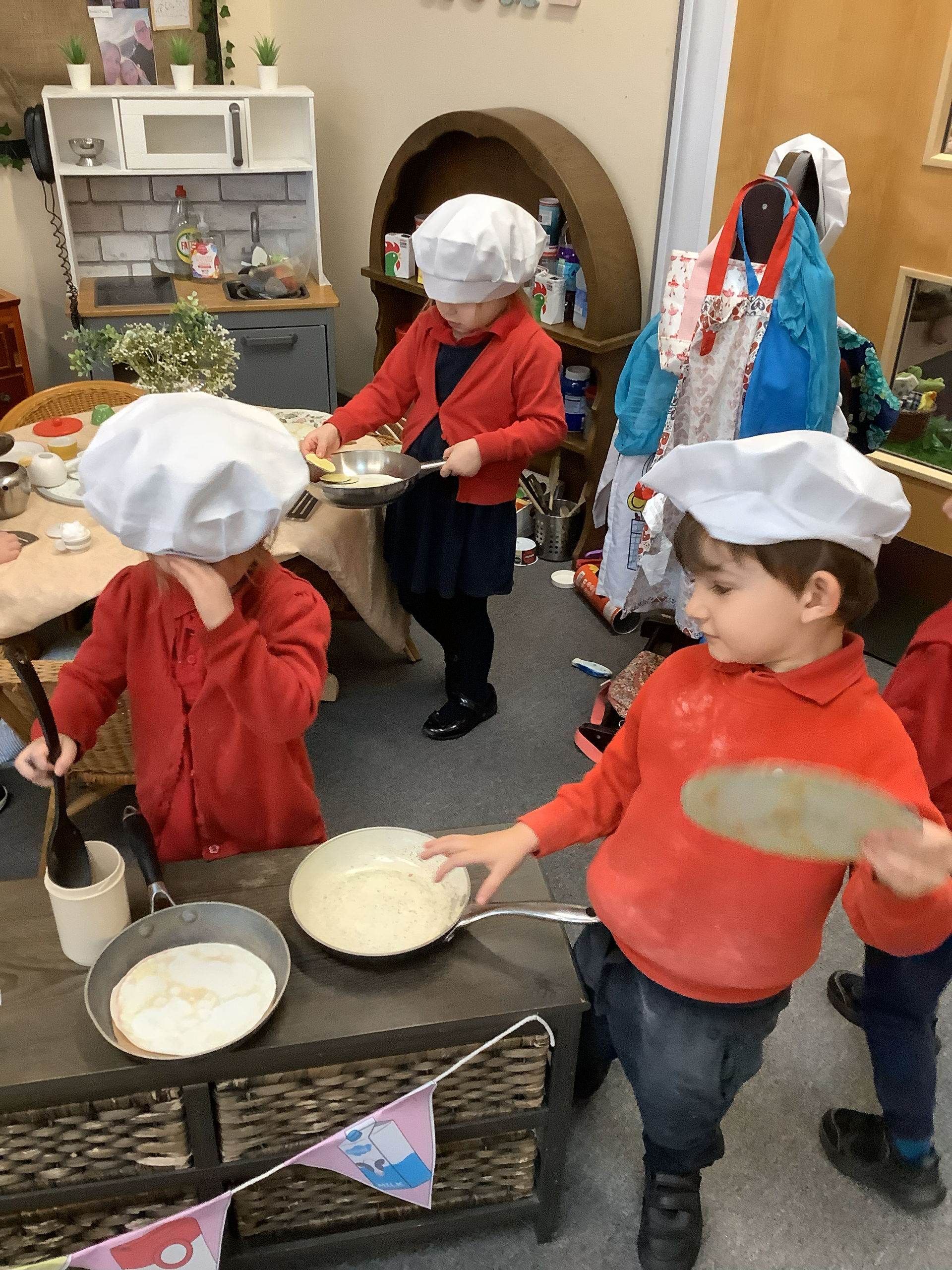 In our role play area we have created a cafe and hot chocolate station as the children have shown an interest and had started to pretend to make each other hot chocolate. Everyone has enjoyed pretending to make hot chocolate and dressing up as bakers.