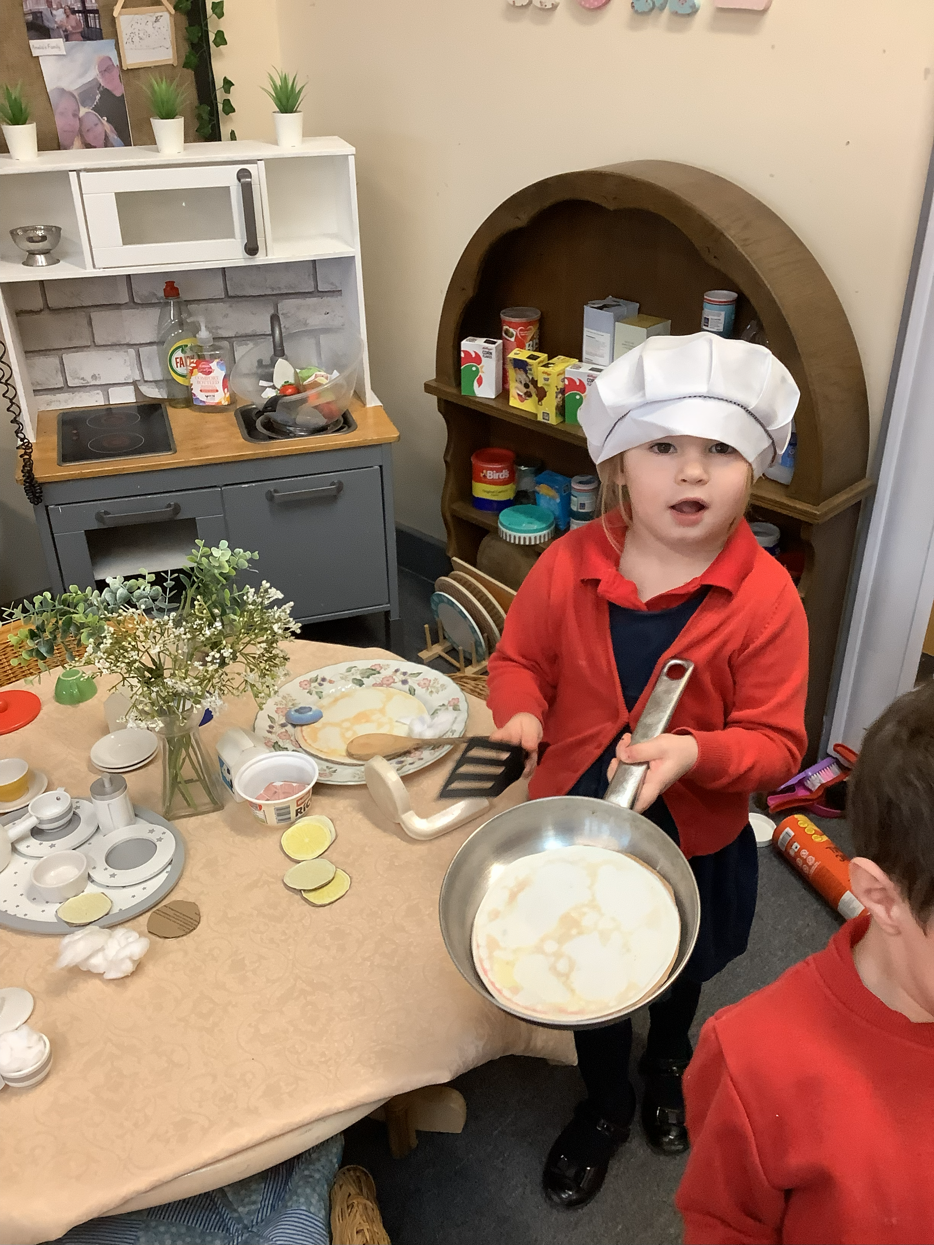 We have had a lovely week at nursery, our focus story was “Mr wolfs pancakes” we all enjoyed the story and talked about pancakes and what we like to put on them. On Tuesday and Thursday, we had some American pancakes for snack and could choose what to have on it. We could choose, golden syrup, lemon juice or jam, everyone enjoyed trying them.
