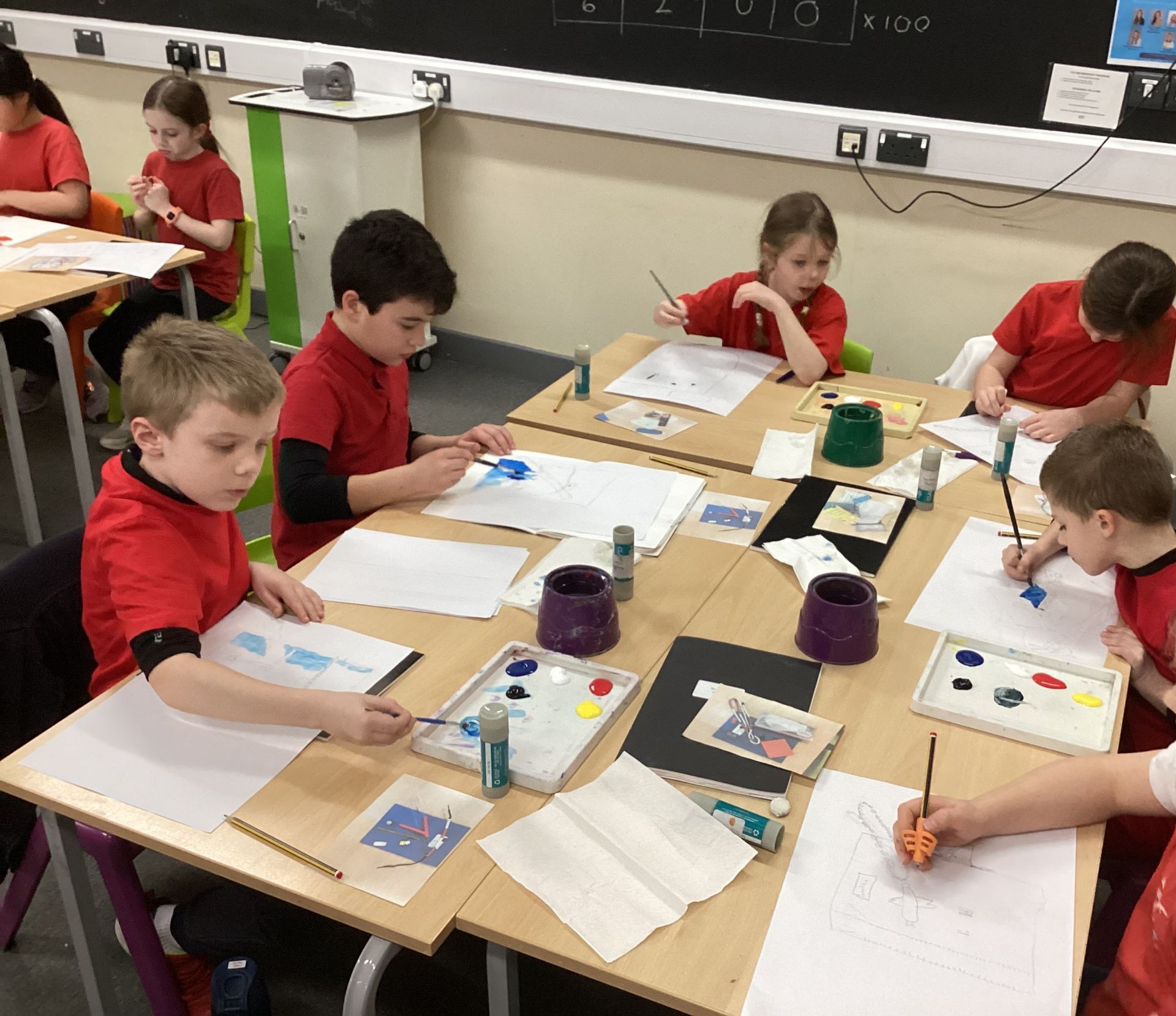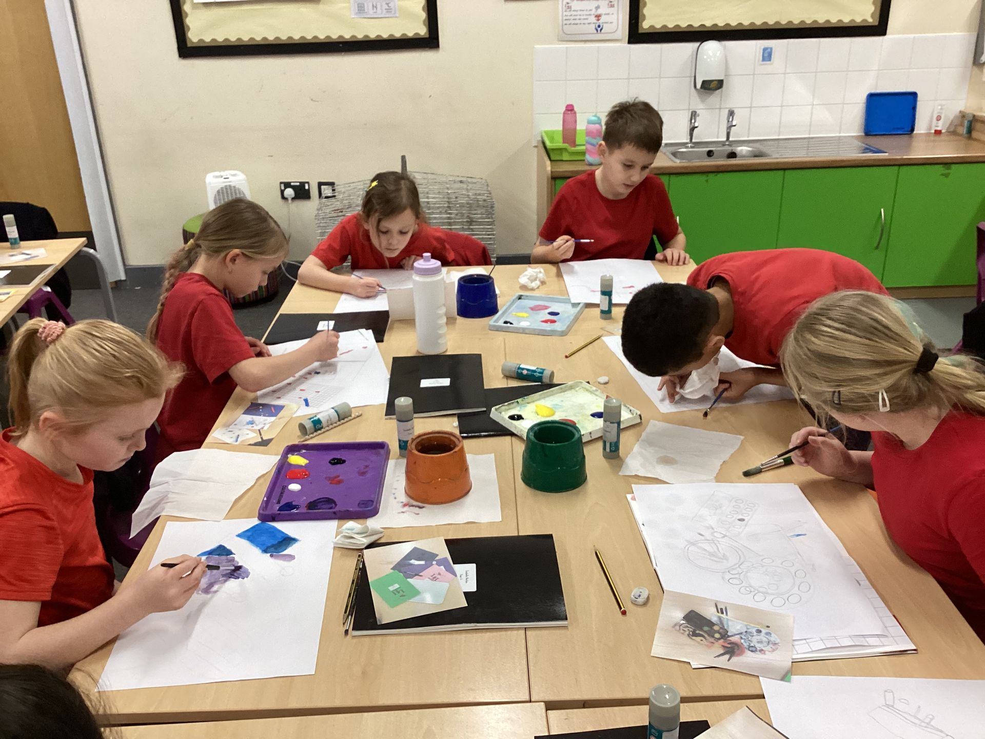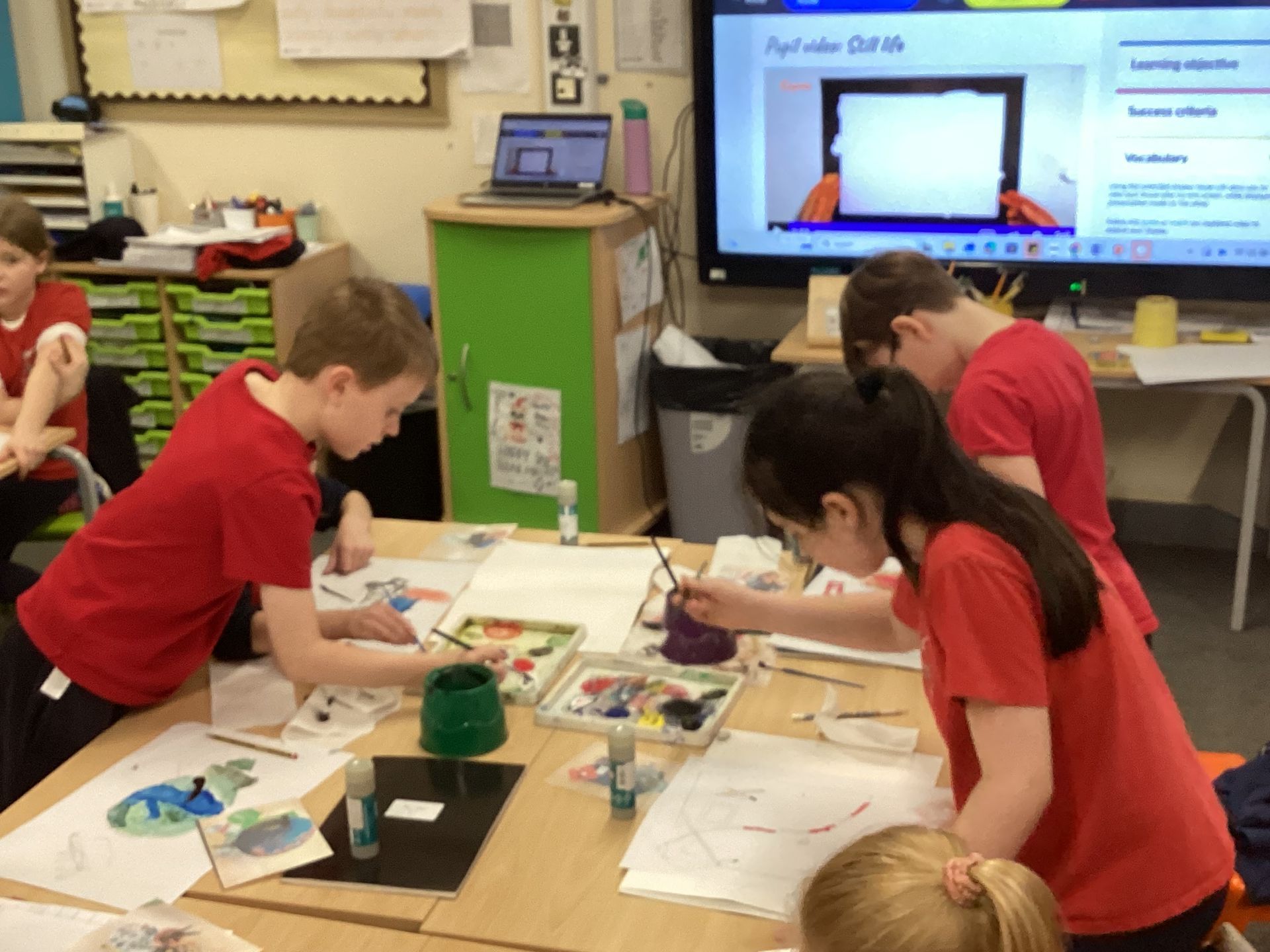 In art lessons the children learnt how to darken or lighten a colour when mixing paint and how to use tints and shades to create three-dimensional effects when painting. They enjoyed using their techniques to create still life paintings of objects representing school life.