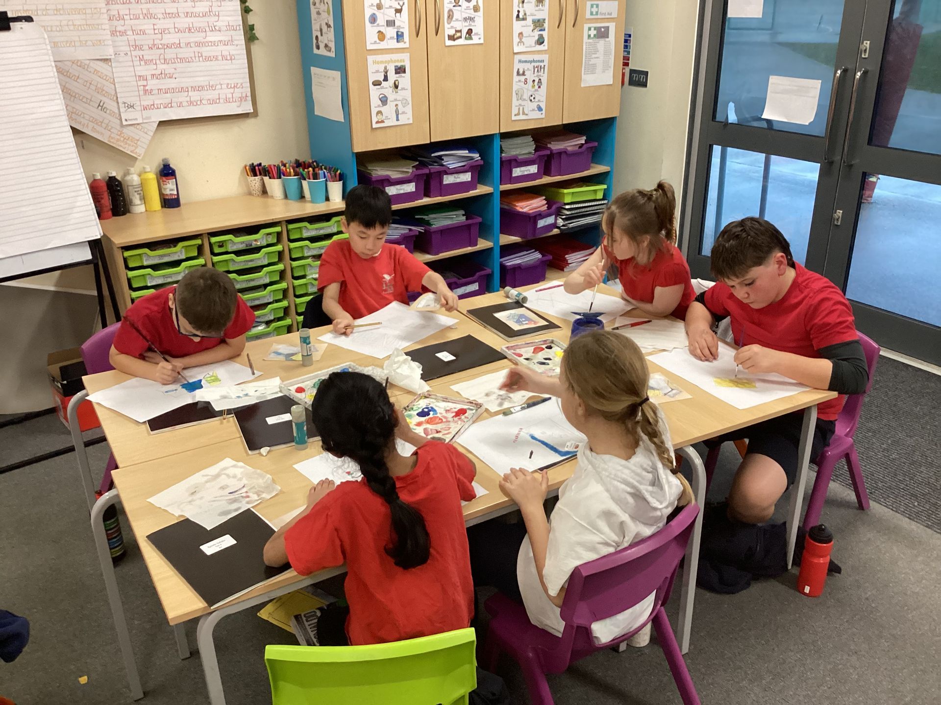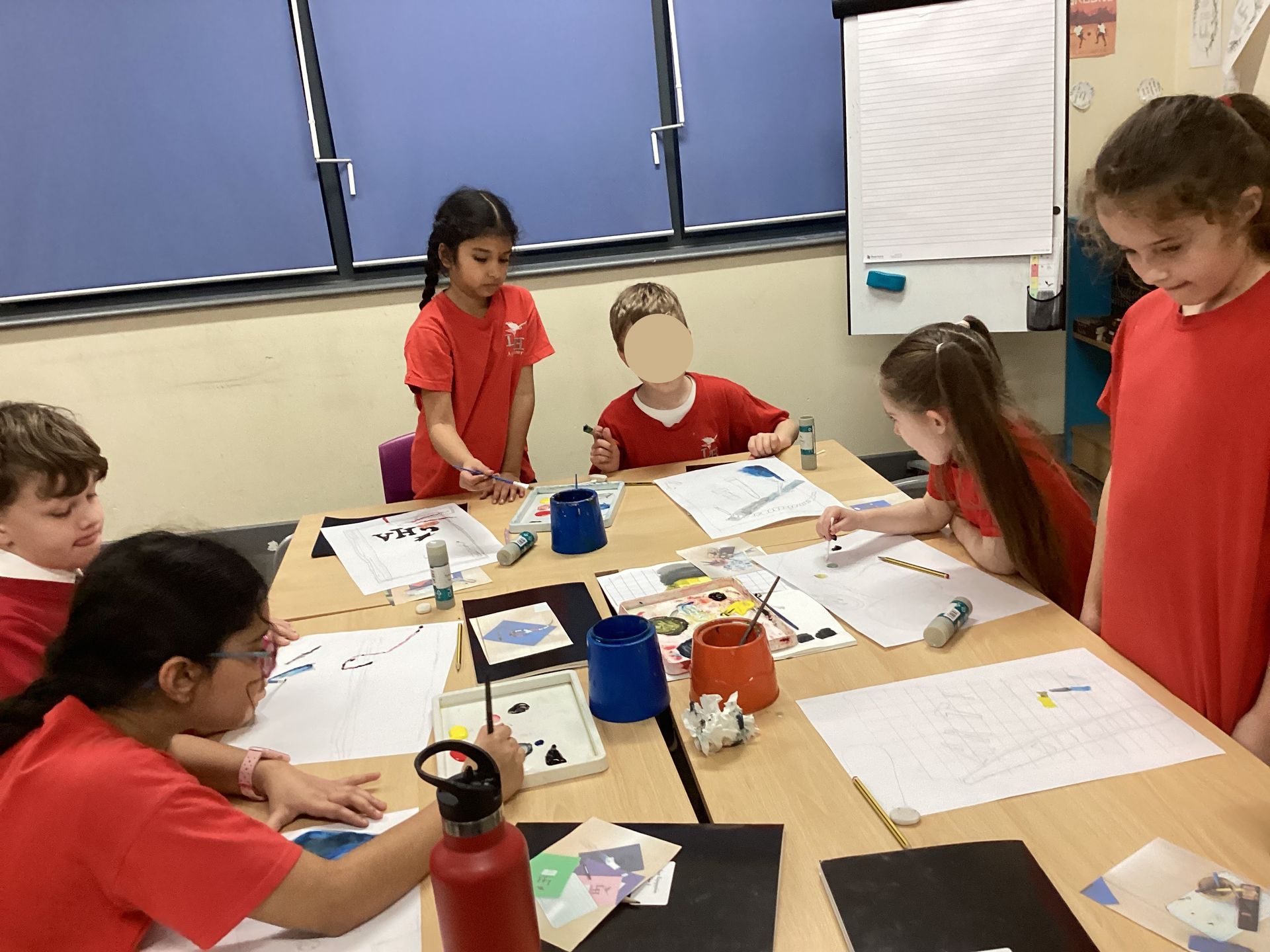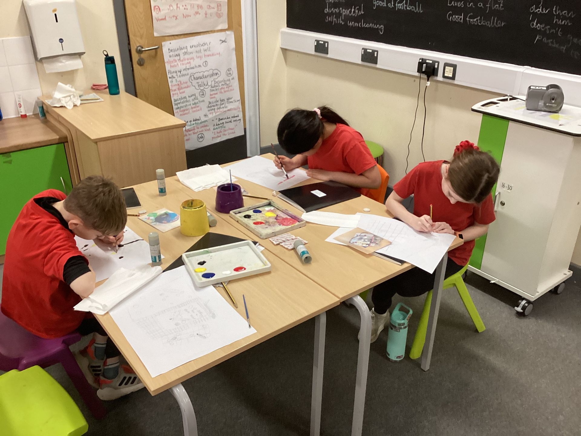 In art lessons the children learnt how to darken or lighten a colour when mixing paint and how to use tints and shades to create three-dimensional effects when painting. They enjoyed using their techniques to create still life paintings of objects representing school life.